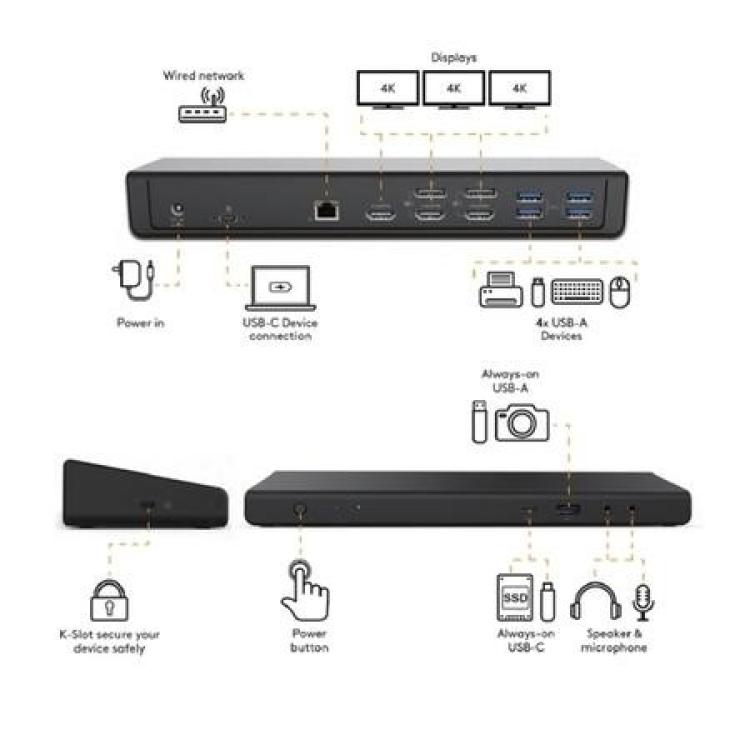 Connect your Windows or Mac OS device to up to three 4K external screens with the 2-POWER? USB-C & USB-A Hybrid Triple 4K Docking Station. Make the most of your workspace by extending your desktop across three 4K screens via USB-C to USB-C cable or USB-A to USB-C cable. The 2-POWER? USB-C & USB-A Hybrid Triple 4K Docking Station adds triple-screen functionality to your workstation with 4K resolution across all three displays (3840 x 2160p).