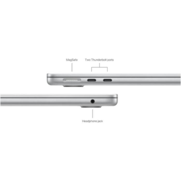 The MagSafe charging cable easily attaches and detaches with magnets, preventing any unintended flights. Two Thunderbolt ports let you connect high-speed accessories and charge your Mac. And the headphone jack supports high‑impedance headphones. With the M3 model, you can access Wi‑Fi 6E, which has up to 2x faster throughput compared to Wi‑Fi 6.