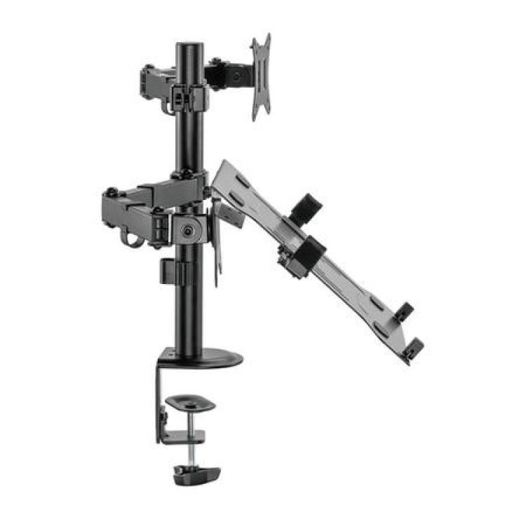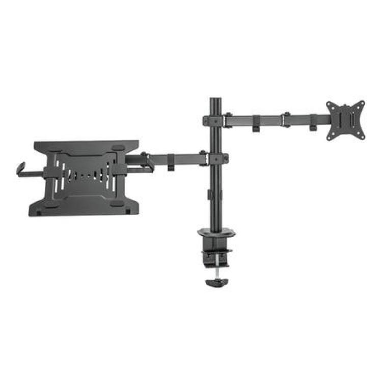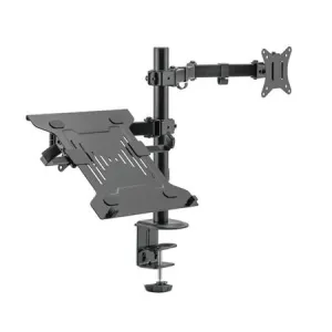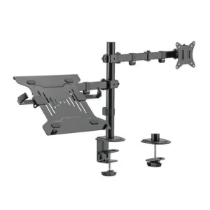 Thanks to its durable steel construction, it provides stable support for a monitor with a diagonal of 17" to 32" weighing up to 9 kg and a laptop weighing up to 4 kg. Flexible construction for sufficient adjustment of height and viewing angles, with the possibility of setting the orientation of the monitor to portrait or landscape. The package includes grommets and clamps for installation on almost any work surface. Removable VESA plate for user-friendly installation. Included in the package are cable clips to facilitate the organization of cable routing.