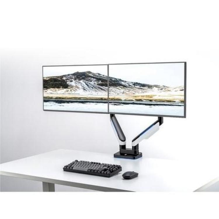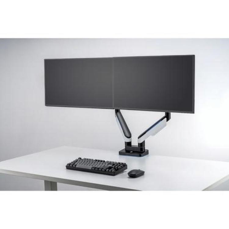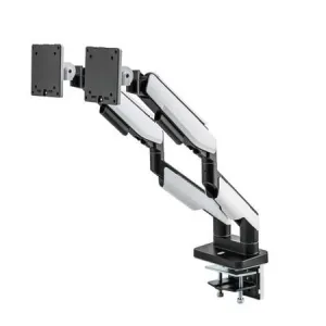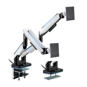 With electriQ Dual Gaming Monitor Arm, multiple lighting effects are available for creating immersive gaming environments. Raise, lower, tilt, swivel – flexible monitor movement enables the gaming setup to be customized for different users. Durable steel and aluminum construction enables each arm to hold most 17”–35” monitors up to 20kg/44lbs (per arm). Integrated 180° rotation stop prevents the arm from hitting adjacent partitions and walls. A quick-release joint design reduces package size for lower shipping and storage costs while contributing to easy user assembly. Perfect for both gaming and working.
