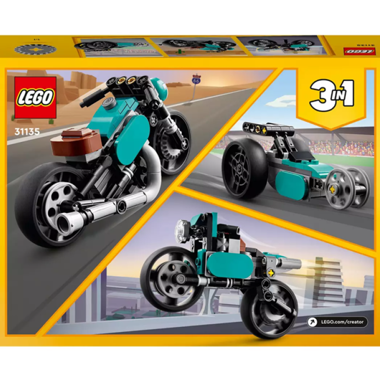 - Kids and lovers of cool vehicles aged 8+ years old can enjoy countless hours of racing action with this brilliant LEGO Creator 3 in 1 Vintage Motorcycle (31135) building toy set. The thrills never stop with this fantastic 3 in 1 building set. The toy motorbike measures over 7 cm (2.5 in. ) high, 13 cm (5 in. ) long and 6 cm (2 in. ) wide.