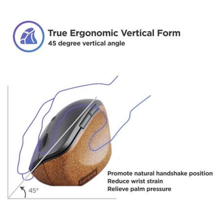 Our hands were not designed to be flat on tables for 8 hours a day, yet that is how mice were designed in the past. The Lenovo Go Wireless Vertical Mouse goes beyond the norm and delivers an experience that replicates the natural form of a handshake with a 45° palm grip and revised finger positioning for optimal posture and productivity.