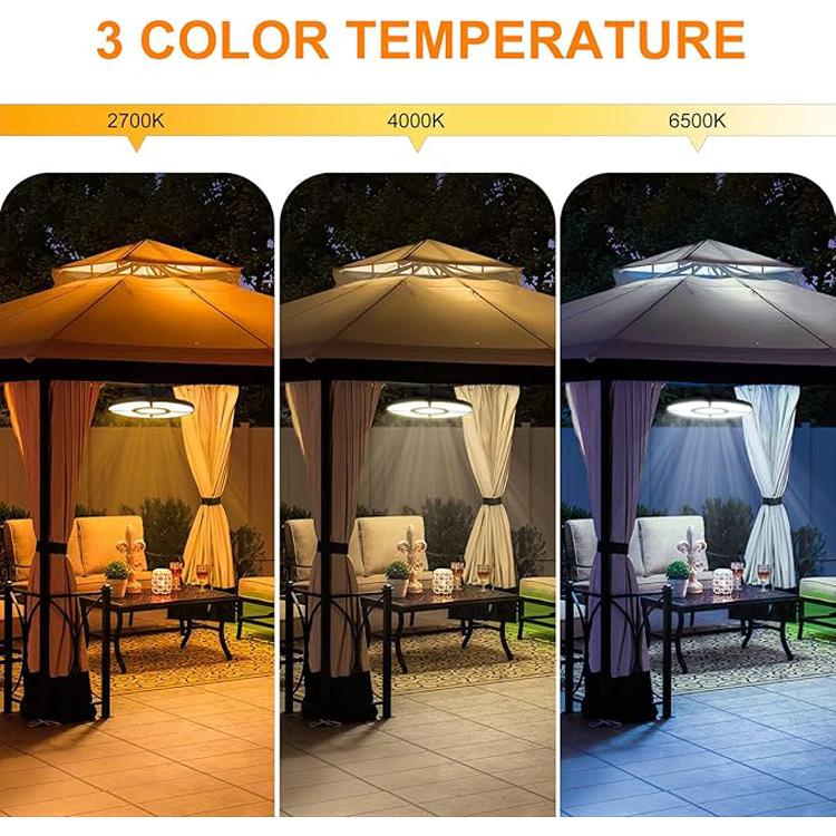 【Smart Remote Control】Comes with a remote controll, you can freely switch the working mode and lighting color. The brightness can be adjusted to 5 levels: 25%-40%-60%-80%-100%. Press the 2H / 3H / 4H key in dusk to dawn mode, indicating that the solar gazebo light will automatically turn off after it works 2/3 /4 hours. Power and mode indicators for easy setup.
