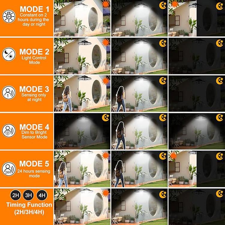 5 Working Mode Available: Dusk to Dawn Mode/Induction only at night/Dim to Bright Sensor Mode/24 hours induction mode/Forced Lighting 2H Mode.