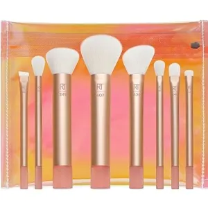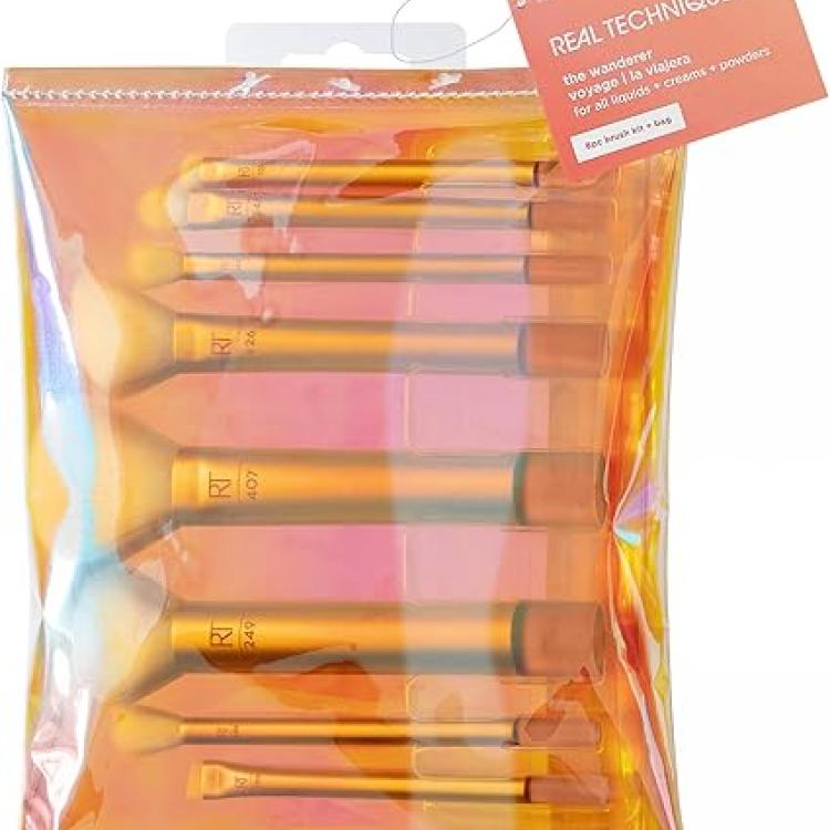 The Real Techniques Wanderer Makeup Brush Kit includes: RT 426 angled multitask brush, RT 407 multitask brush, RT 246 concealer brush, RT 249 foundation buffing brush, RT 358 blending shadow brush, RT 359 tapered shadow brush, RT 356 angled liner brush, RT 332 smudge brush and bag