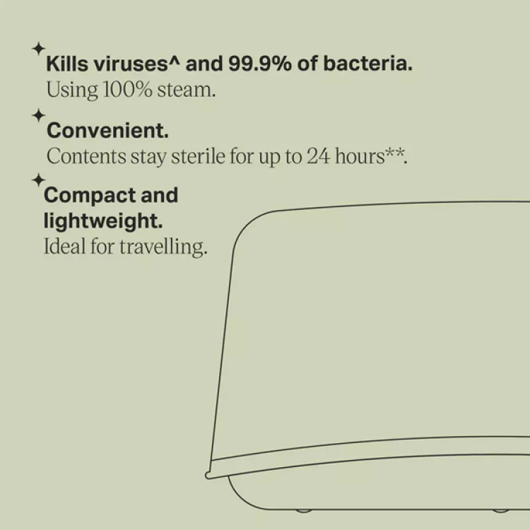 - Save time and stay organised: When the lid is closed properly, freshly steamed contents stay sterile for up to 24 hours, so you can sterilise your bottles and other feeding accessories in advance.
