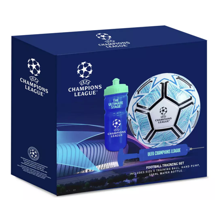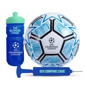 Embrace the excitement of UEFA Champions League with this officially licensed gift set. Featuring a 500ml water bottle, a size 5 football, and a ball inflation pump, it's the ultimate package for football enthusiasts. Stay hydrated in style, perfect your skills with the quality football, and keep it ready for action with the included pump. Whether for practice sessions or matchday, this set embodies the spirit of the Champions League, making it an ideal gift for fans seeking both utility and passion in their football gear.