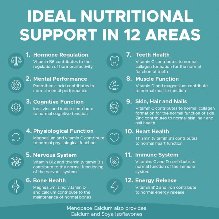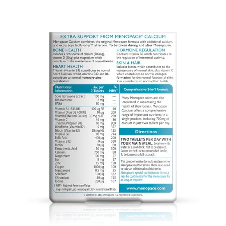 Looking after your bone health is a priority during perimenopause, and during and after the menopause, Menopace Calcium is a comprehensive formulation of 24 nutrients including 700mg of calcium.