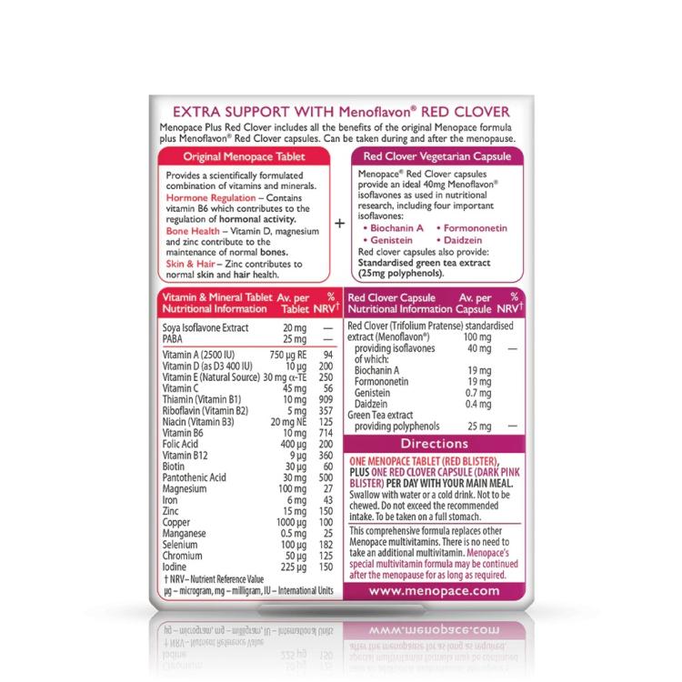 This dual pack includes all the benefits of Menopace Original tablets plus natural Red Clover isoflavone capsules, for before, during and after the menopause.