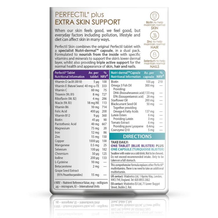 Perfectil Skin combines the original Perfectil tablet with a Nutri-dermalTM capsule in a dual pack. Including biotin, Omega-3 fatty acids and Coenzyme Q10.