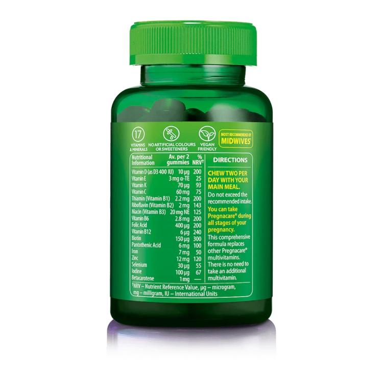 Specially formulated to provide the essential nutrients for pregnancy in a delicious blueberry and strawberry flavoured chewable gummy. Includes 17 important nutrients such as folic acid, vitamin D and much more. From Pregnacare - the UK’s No.1 pregnancy supplement brand.