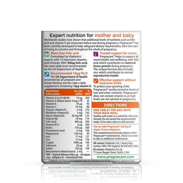 Formulated by experts and trusted by mums for generations, this is an ideal tried and tested way to safeguard a mother's diet during pregnancy. Pregnacare is also the UK’s No.1 pregnancy supplement brand.