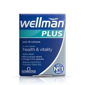 Provides all the benefits of the Wellman Original multivitamin tablet - which contains essential nutrients for health & vitality, plus an Omega-3-6-9 capsule to provide a rich source of DHA and EPA. Wellman is also the UK’s No.1 men’s supplement brand.