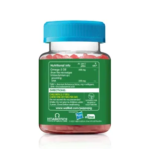 Essential fatty acids in a form that kids enjoy taking. Wellkid Peppa Pig Omega-3 soft jellies are packed with highest quality DHA derived from natural vegan plant sources (algae). Omega-3 provides DHA which contributes to the maintenance of normal brain function and normal vision*.